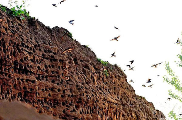 崖沙燕因喜欢在沙土崖壁上筑巢而得名,又被称“崖壁建筑师”。 许昌环保人士赵宏冉介绍,崖沙燕通常营巢于河流或湖泊岸边沙质悬崖上,由雌雄成鸟轮流在沙质悬崖峭壁上用嘴凿洞为巢,巢呈水平坑道状,深度为0.5米到1.3米。