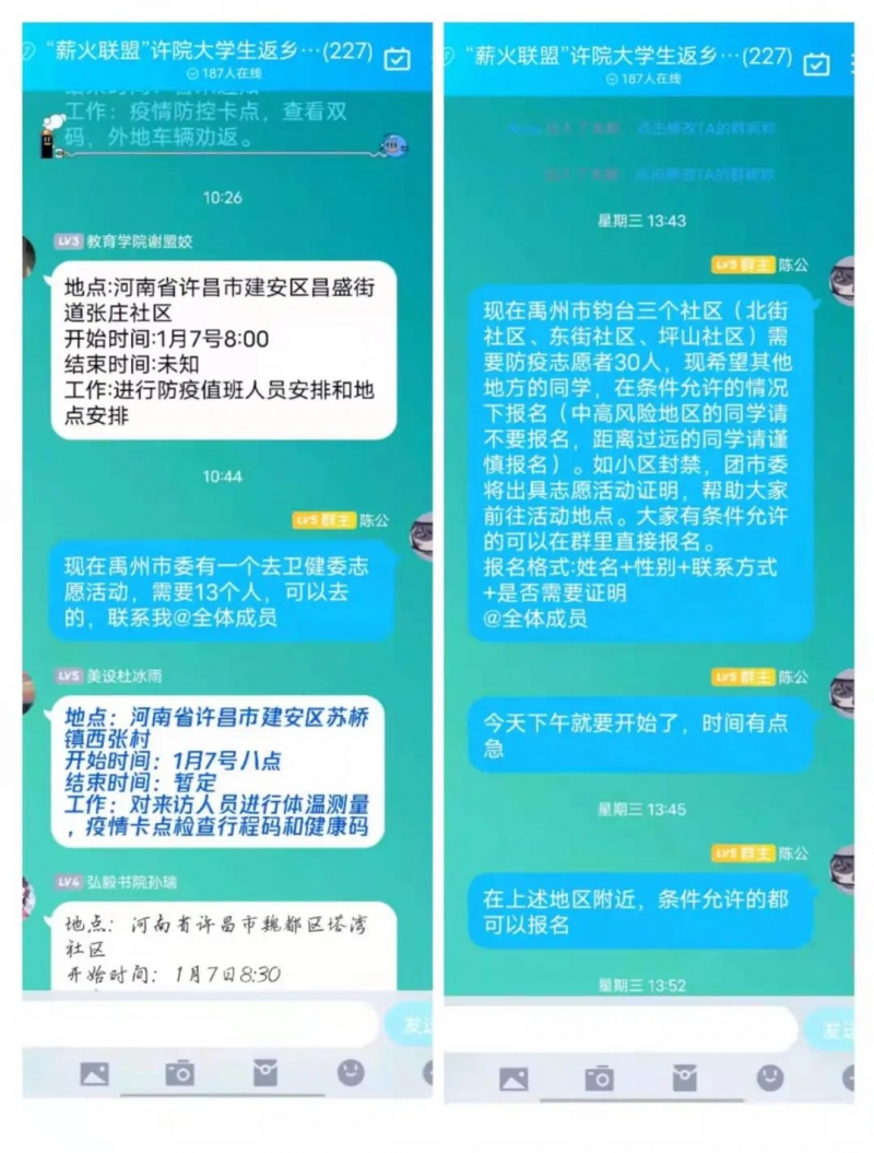 虽然来自不同的学校,以前并不相识,但在抗击疫情中,大家风雨同舟,齐心抗疫,拧成了一股绳。目前,这支队伍里有来自哈尔滨理工大学、上海工程技术大学、郑州大学、河南中医药大学、商丘学院、河南医学高等专科、洛阳师范学院、白城师范学院、郑州商学院、黄河交通学院、郑州师范学院、郑州西亚斯学院等十余所高校的学生300余人。