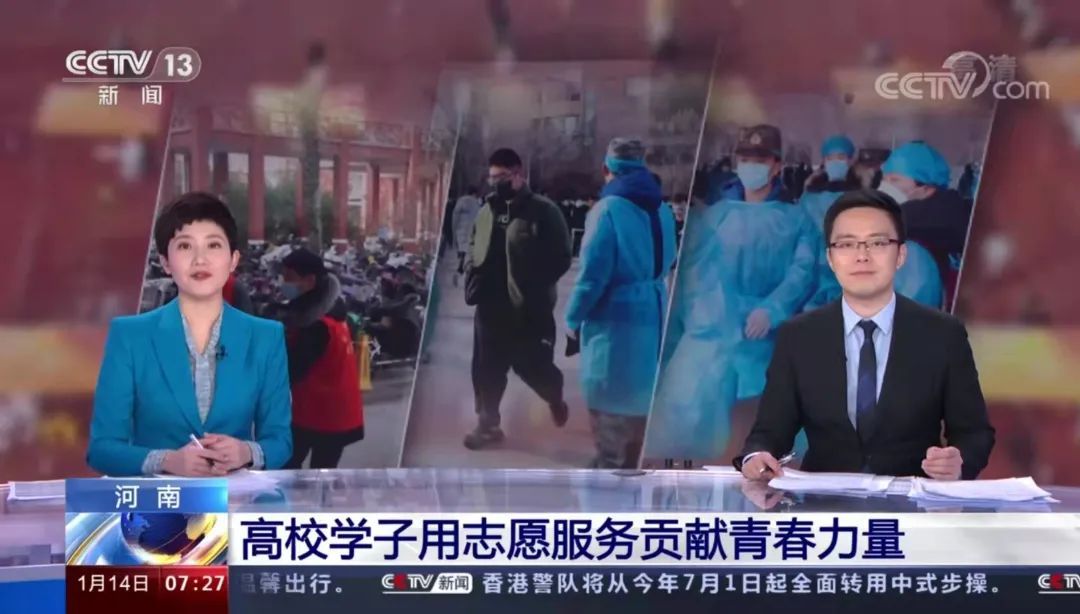 “面对疫情,bet36体育在线成立返乡大学生志愿服务队,不同专业的三百多名大学生志愿者,活跃在移动方舱实验室核酸检测、社区街道疫情防控、配送物质等各个岗位上”,2022年1月14日,央视《朝闻天下》以《河南高校学子用志愿服务贡献青春力量》为题,报道了在河南各地守护家乡的bet36体育在线返乡大学生志愿服务队,在抗疫一线贡献青春力量。bet36体育在线返乡大学生志愿服务队在上级团组织和学校党委的领导下、学校团委的指导下,始终坚持围绕中心、服务大局,组织3600余名志愿者向社区(村)党团组织报到,在筑牢疫情防控安全防线、维护群众生命财产安全、参与基层社会治理、推动脱贫攻坚和乡村振兴有效衔接等具体实践中,累计服务时长达28万8千余小时,发挥青年生力军和突击队作用,提升服务社会能力,践行“请党放心、强国有我”的青春誓言。
