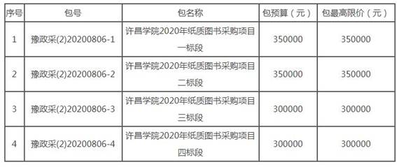 每个包段预算情况:标段一:实洋35万元人民币;标段二:实洋35万元人民币;标段三:实洋30万元人民币;标段四:实洋30万元人民币;