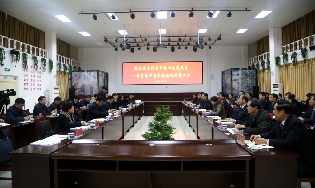 11月22日、23日,许昌市委书记武国定到bet36体育在线调研并为bet36体育在线师生作题为《许昌的昨天、今天和明天》的专题报告。市委常委、常务副市长石迎军,市委常委、市委秘书长王堃,副市长秦春梅陪同调研。院长赵继红等全体校级领导干部、全体中层干部、教授、博士、二级学院系主任、教研室主任、学生代表等参与调研座谈活动,并聆听了精彩报告。