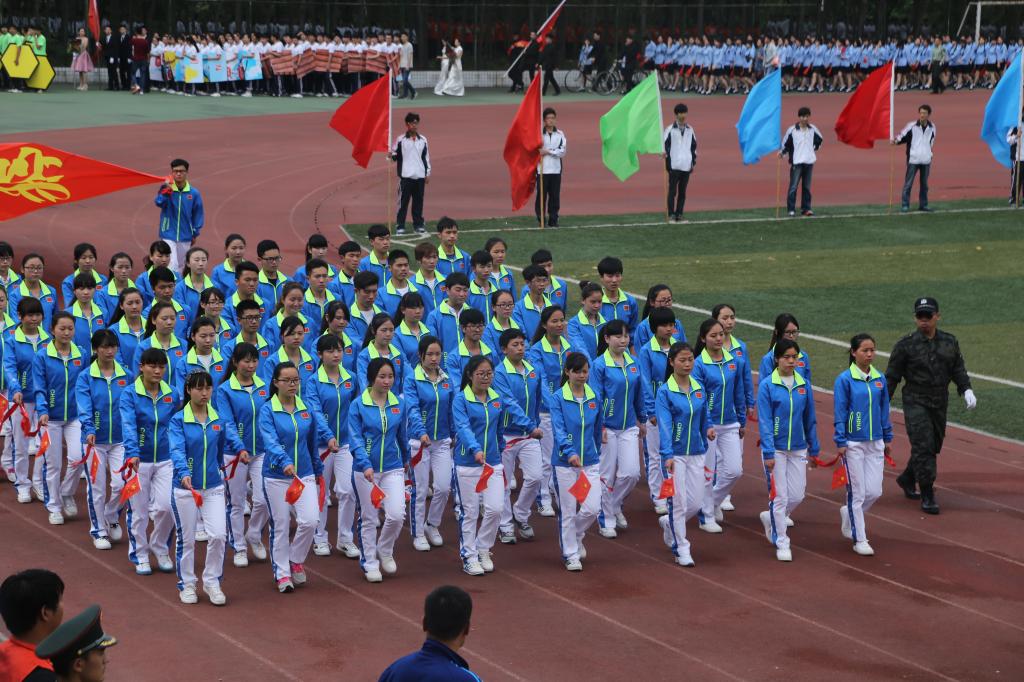 上午8时,伴随着雄壮激越的《运动员进行曲》,全体裁判员、运动员在校旗、运动会会徽和彩旗方队的引导下入场。