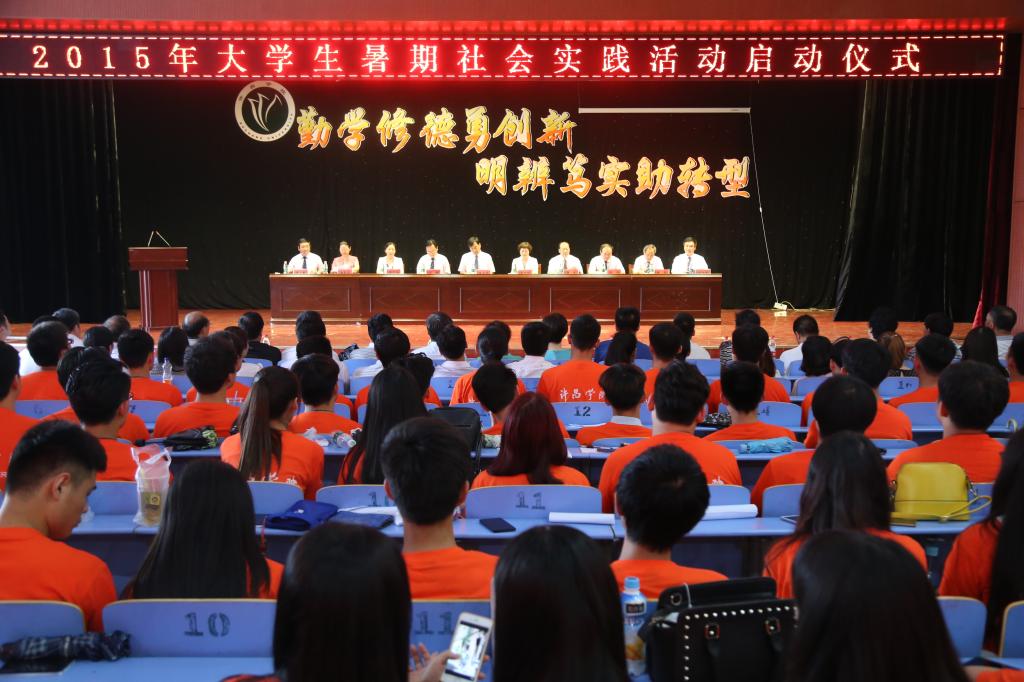 6月27日下午,bet36体育在线2015年大学生暑期社会实践活动启动仪式在大学生活动中心多功能演播厅举行。院长赵继红,党委副书记马超,副院长崔斌、黄怡俐、郭涛出席会议。党委宣传部、党委学生工作部、教务处,各院部党总支书记、副书记,各院部实践团队指导老师,各院部团总支负责人,社会实践学生代表近600人参加了大会。启动仪式由校团委书记张鹏辉主持。