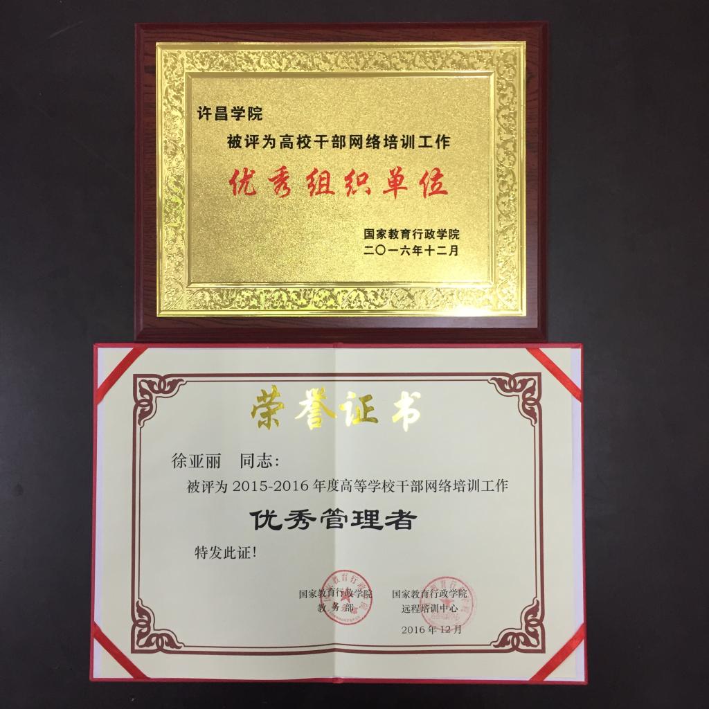 近日,2016年高校干部培训管理者培训班在国家教育行政学院举行。培训以学习贯彻中央关于高校干部教育培训工作的新精神新要求为主旨,围绕“互联网+”与干部培训创新、干部网络培训体系建设开展交流研讨,分享各地、各高校干部培训工作经验,总结2015-2016年度高校干部网络培训工作。bet36体育在线及其他81所高校在高等教育干部网络培训工作中表现突出,被评选为“高校干部网络培训工作优秀组织单位”,徐亚丽同志被评为“高等学校干部网络培训工作优秀管理者”。