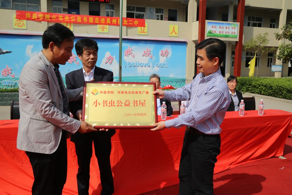禹州市副市长寇鸿顺、bet36体育在线党委宣传部部长冯晓民为梁北二中授小书虫公益书屋牌匾