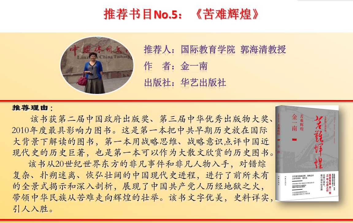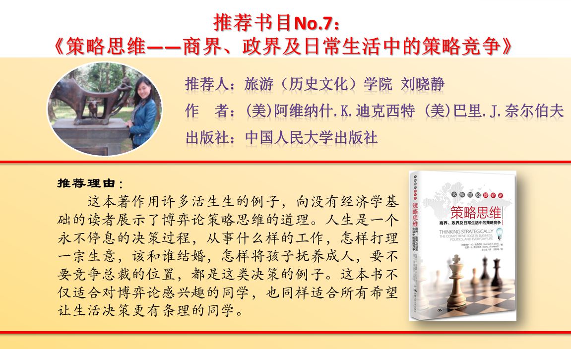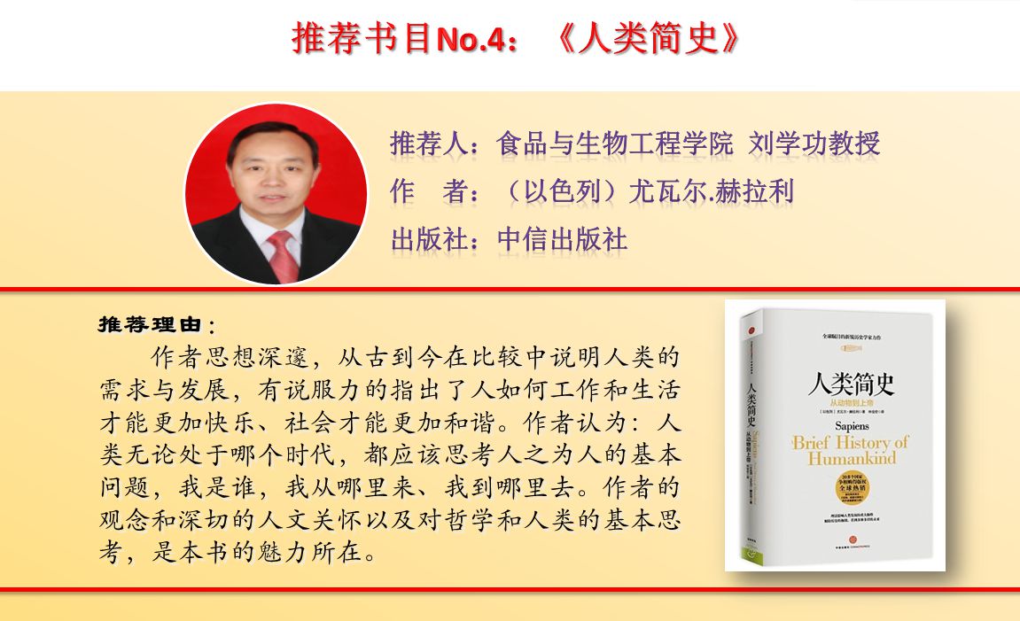 【编者按】为进一步激发全校师生爱读书、会读书、读好书的浓厚兴趣,努力营造书香校园的良好氛围,校党委宣传部(新闻中心)联合图书馆,今年继续策划推出荐书专题活动。“教授为你列书单”(第二季)邀请了16位教授(副教授)精心推荐经典好书16本。同时,活动还特别邀请了部分优秀青年教师开展了“青椒”(青年教师)荐书活动,共有14位青年教师推荐图书14本。学校官方网站、校报、官方微博、微信公众号、校园广播等多种媒体平台现将荐书活动同步推送,敬请关注。