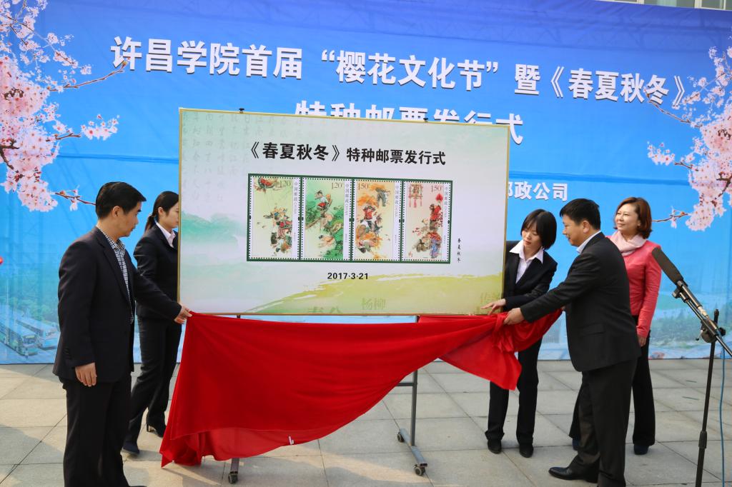 3月21日,由中国邮政发行的《春夏秋冬》特种邮票许昌首发仪式在bet36体育在线举行。该特种邮票一套4枚,图案内容分别为“春燕剪柳”、“夏荷戏水”、“秋鸡鸣穗”和“冬雪映梅”,全套邮票面值为5.40元人民币。
