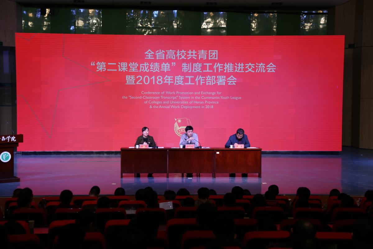 3月9日,全省高校共青团“第二课堂成绩单”制度工作推进交流会暨2018年度工作部署会在bet36体育在线成功举办。共青团河南省委副书记王笃波、全国学校共青团研究中心活动部部长马海、bet36体育在线学校党委副书记孙海、副院长黄怡俐,共青团许昌市委书记陈涛、PU口袋校园副总经理郑岚出席会议,南京工业大学、河北建材职业技术学院、山东工商学院等高校相关负责人,全省高校团委书记及“第二课堂成绩单”制度相关负责老师,bet36体育在线相关职能部门负责人共计300余人参加会议。