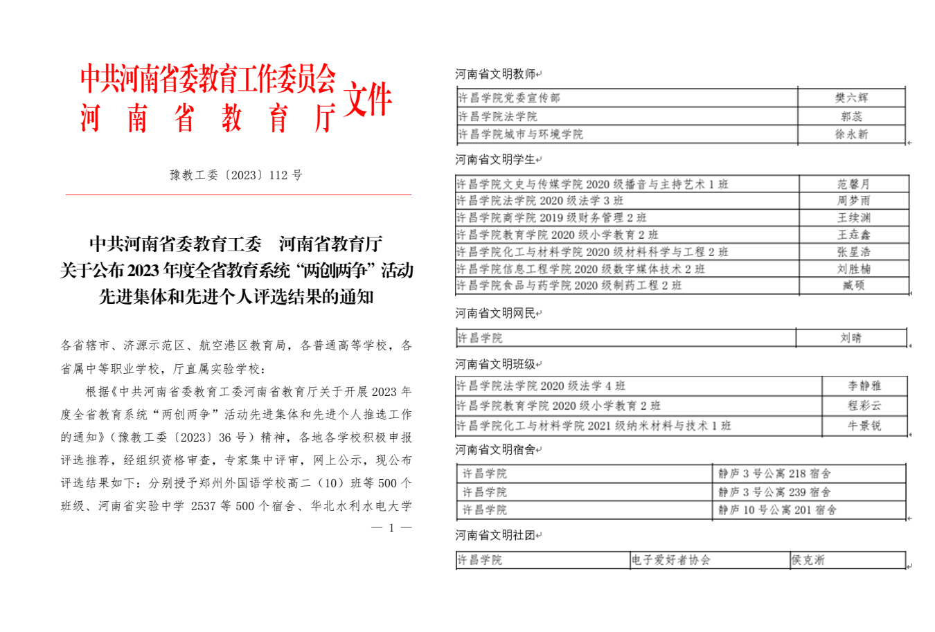 近日,中共河南省委教育工委、河南省教育厅印发《关于公布2023年度全省教育系统“两创两争”活动先进集体和先进个人评选结果的通知》(豫教工委〔2023〕112号),对2023年度全省教育系统“两创两争”活动先进集体和先进个人进行表彰,bet36体育在线喜获多项荣誉。