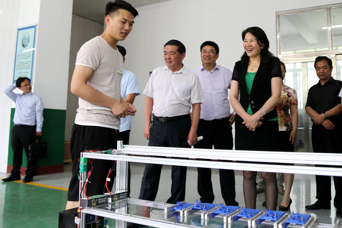 在电气(机电)工程学院的科技创新中心,霍金花考察了机器人装备测试区、智能电网设备生产线,并饶有兴致观看了中心师生设计研发的机器人、智能辅助停车模型、3D打印设备等,并与项目负责学生沟通,了解项目原理、应用化前景等情况,她鼓励学校把中心建设成开放式大学生科技学术活动实践基地,希望同学们发挥专业特长,坚持理论知识与实践相结合,服务经济社会发展。