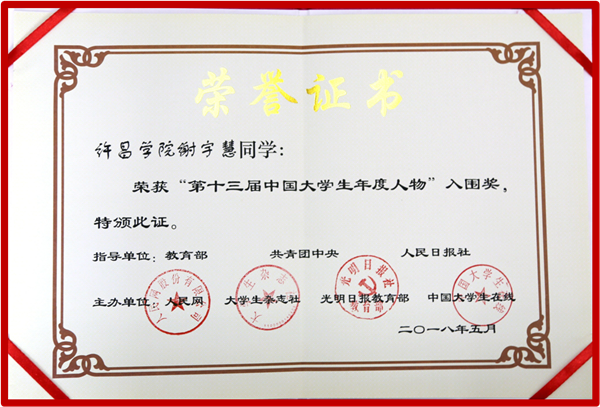 近日,由教育部、共青团中央、人民日报社共同指导,人民网、大学生杂志社、光明日报教育部和中国大学生在线联合主办的“第十三届中国大学生年度人物评选”结果揭晓,经过学校推荐、通讯评审、网络展示和会议终评等环节,bet36体育在线信息工程学院谢宇慧同学荣获“第十三届中国大学生年度人物”入围奖(全国200强)。