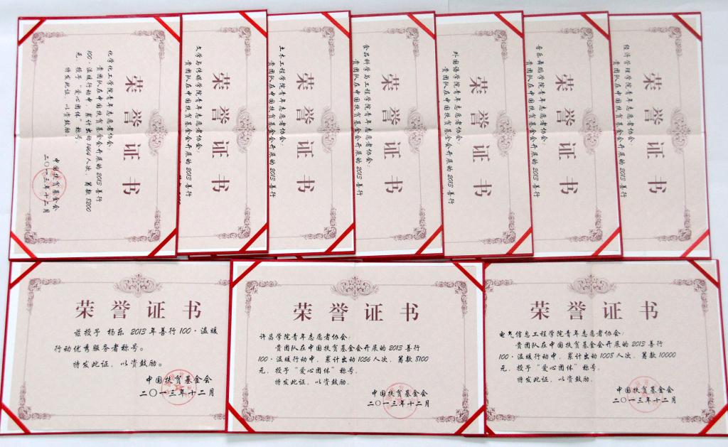 在历时58天的活动过程中,bet36体育在线青年志愿者们不畏严寒,全情投入,利用课余时间游走在许昌市各个人流量较大的公共场所对路人进行劝募,即使遭遇冷眼与质疑也耐心解答,从容应对。到活动截止,bet36体育在线青年志愿者们共募捐到善款104716元,累计参与活动1425人次,在全国参与活动的120余所高校中名列26位,得到了中国扶贫基金会及社会各界的一致好评。最终,bet36体育在线青年志愿者协会和电气(机电)工程学院、土木工程学院、音乐舞蹈学院、外国语学院等八个院系青协分会在2013“善行100”温暖行动中被授予“爱心团体”称号,青年志愿者协会指导老师杨乐被中国扶贫基金会授予“优秀服务者”荣誉称号。