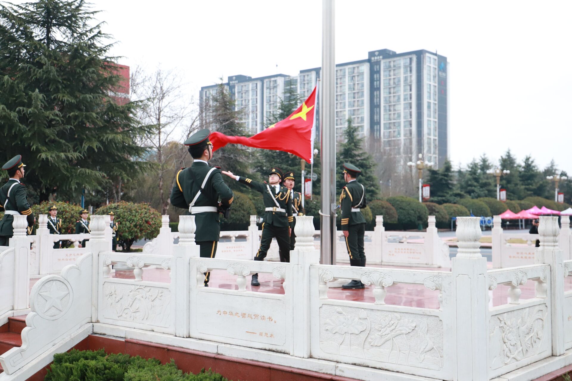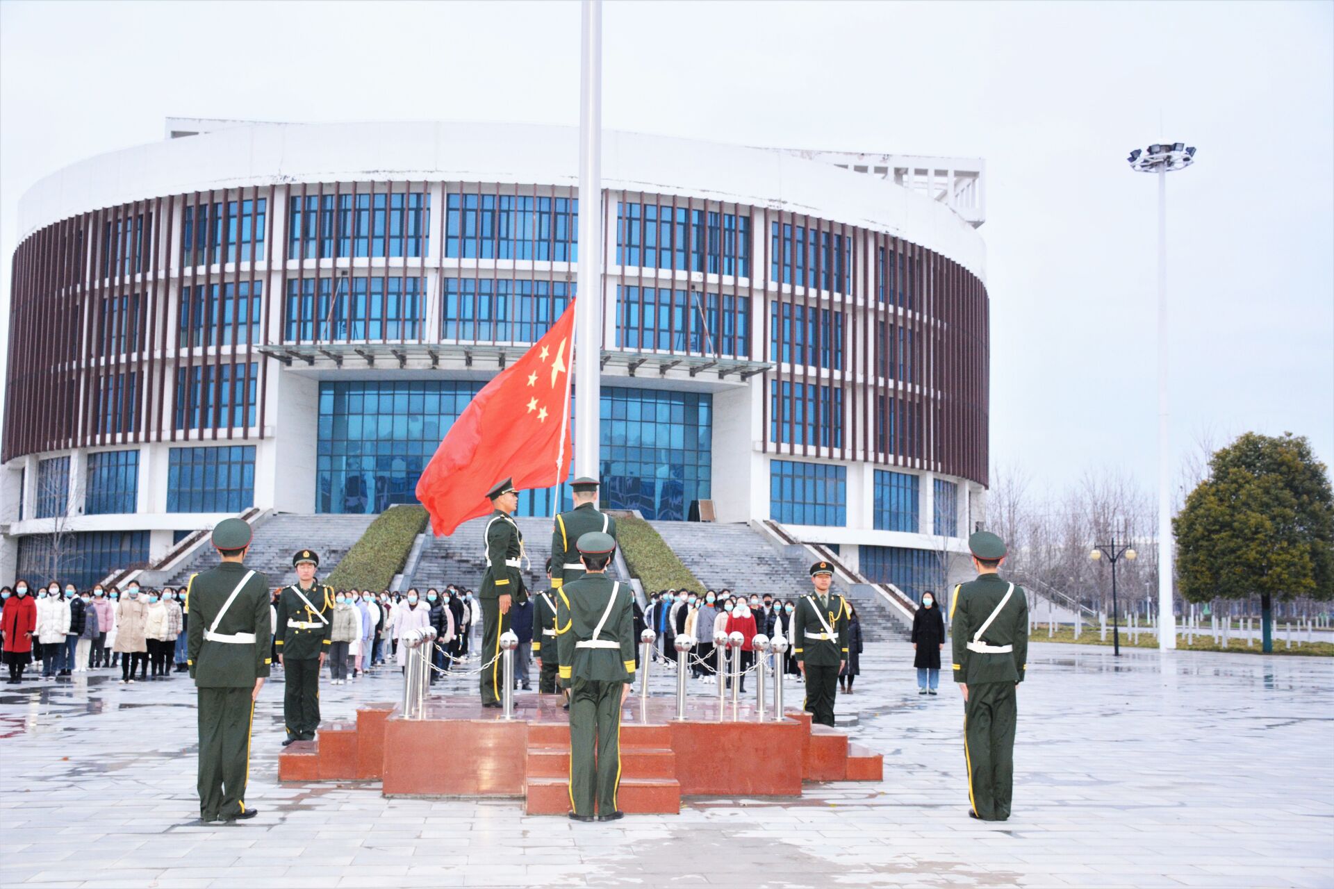 7点整,在全体师生的注目下,国旗护卫队队员护送着鲜艳的五星红旗,迈着整齐矫健的步伐走上国旗台。在雄浑嘹亮的国歌声中,鲜艳的五星红旗冉冉升起。现场庄严肃穆,师生们面向国旗行注目礼。