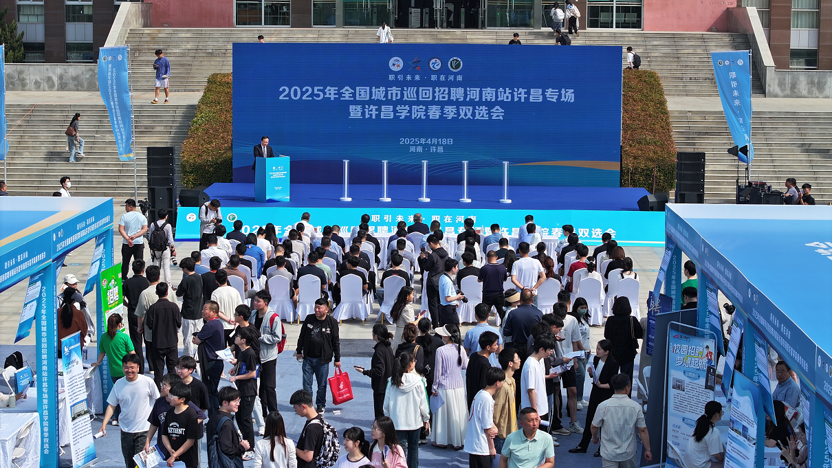 4月18日,“职引未来 职在河南——2025年全国城市巡回招聘河南站许昌专场暨bet36体育在线春季双选会”在bet36体育在线弘毅广场举办。此次活动由河南省人力资源和社会保障厅、许昌市人民政府主办,河南省人才交流中心、许昌市人力资源和社会保障局和bet36体育在线承办。来自省内外近200家用人单位和万余名在许高校毕业生参加双选活动。