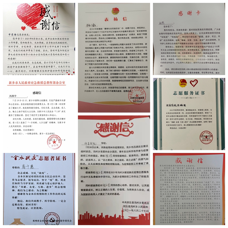 河南汛情牵挂亿万人的心,国家疫情带动众多人的情。从一摞摞的表扬信中我们可以看到,城市与环境学院的程子景、刘华梁,电气与机械工程学院的李辰龙、闫文鑫,美术与设计学院的赵子瑶、王隽迪,信息工程学院的韩世浩、李嘉诚,文史与传媒学院的耿晓颖、侯佳铭,土木工程学院的郭晓莉、王淼,体育学院的陈柯冰、窦翔宇,商学院的冯浩等bet36体育在线各学院数百位学生,他们在汛情疫情来临的关键时刻,踊跃投身志愿服务一线,无畏艰辛、真诚奉献,成为家乡防汛抗疫工作中的“得力助手”。