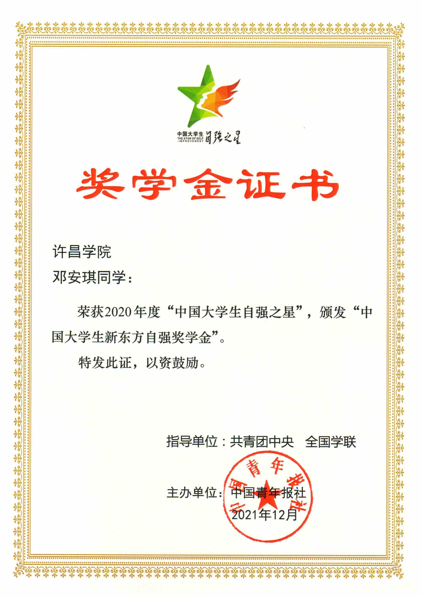 近日,由共青团中央、全国学联指导,中国青年报社主办的2020年度寻访“中国大学生自强之星”活动评选结果正式揭晓,bet36体育在线文史与传媒学院邓安琪同学,经学校推荐、省级初评、全国评审等环节,荣获“中国大学生自强之星”称号,并获得“中国大学生新东方自强奖学金”。