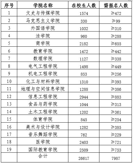 1.组织学生通过登录全国大学生职业规划大赛平台(网址:zgs.chsi.com.cn)完成报名并提交合格作品方可算作成功参赛。报名系统开放时间为2024年11月7日,报名截止时间为11月30日。根据bet36体育在线情况,报名人数不低于学院在校生的30%(见下表),此项工作计入学院年度就业创业工作考核和优秀组织奖评比。