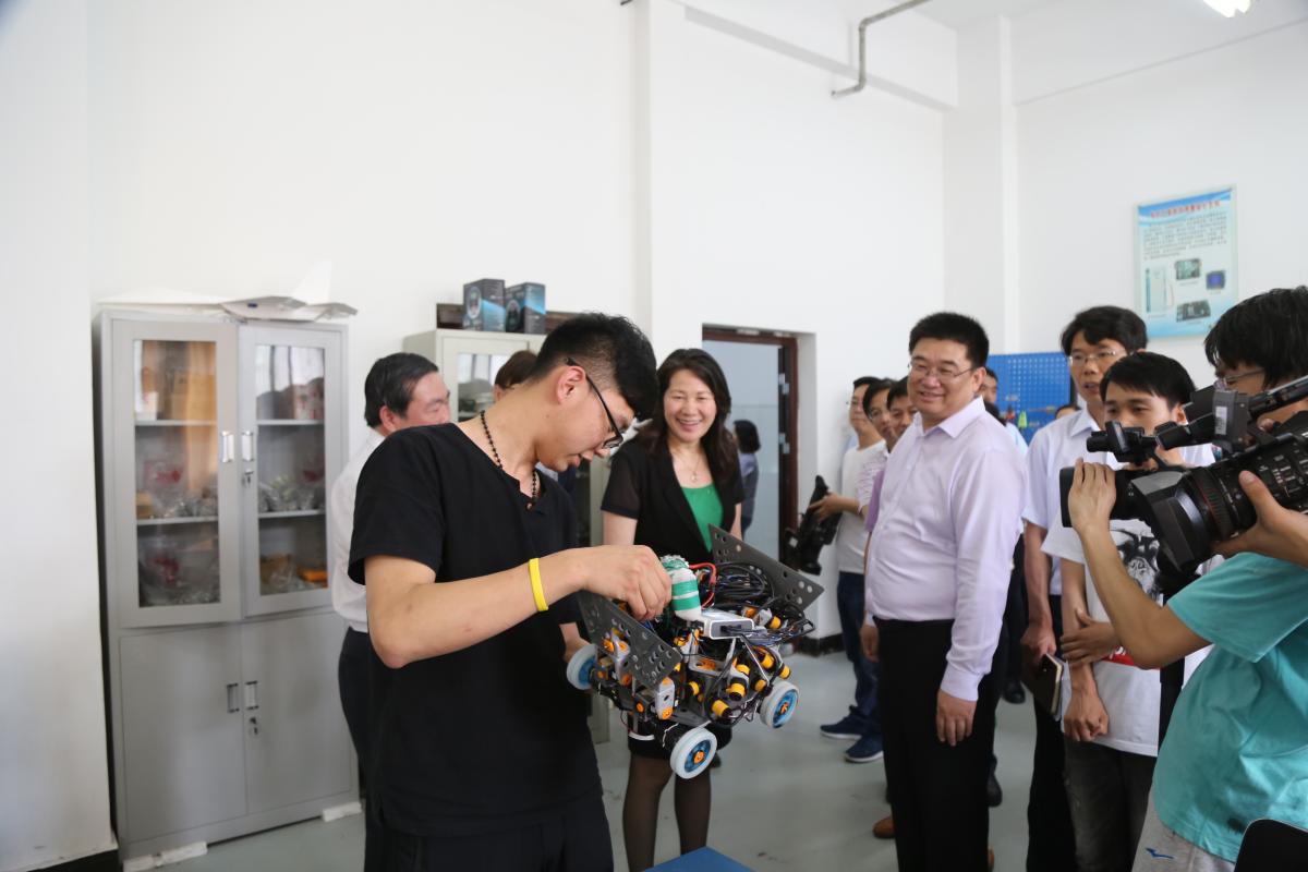 在电气(机电)工程学院的科技创新中心,霍金花考察了机器人装备测试区、智能电网设备生产线,并饶有兴致观看了中心师生设计研发的机器人、智能辅助停车模型、3D打印设备等,并与项目负责学生沟通,了解项目原理、应用化前景等情况,她鼓励学校把中心建设成开放式大学生科技学术活动实践基地,希望同学们发挥专业特长,坚持理论知识与实践相结合,服务经济社会发展。
