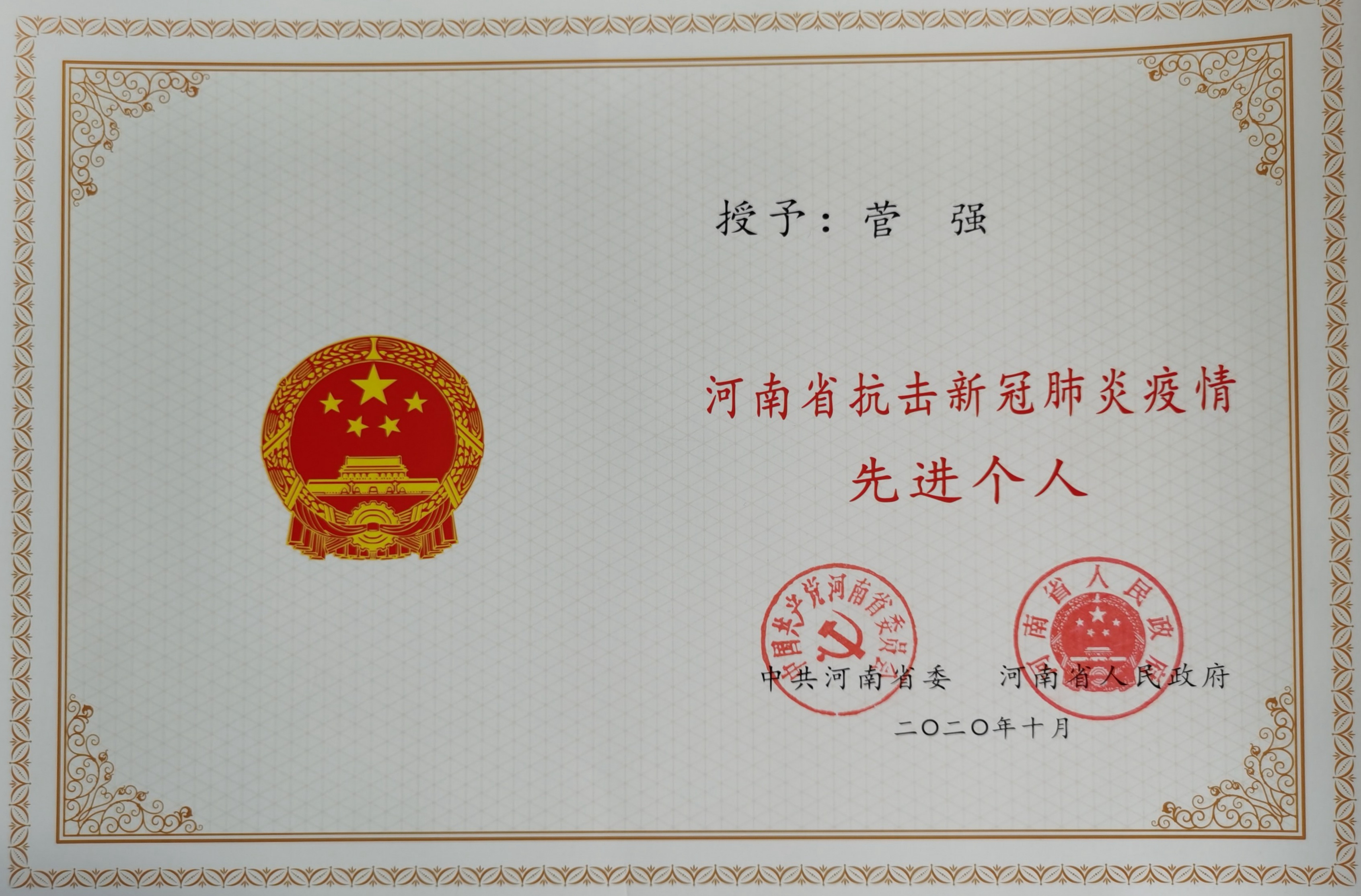 近日,河南省抗击新冠肺炎疫情表彰大会在郑州隆重举行。省委书记王国生出席会议并讲话,省长尹弘主持会议,省政协主席刘伟出席会议。bet36体育在线党委书记闫纪建代表学校参加会议,马克思主义学院菅强同志荣获“河南省抗击新冠肺炎疫情先进个人”称号。