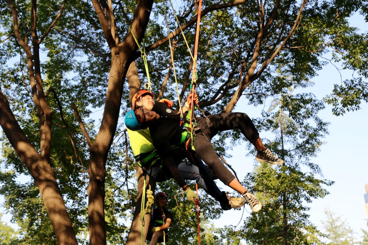 任课老师李学良告诉我们,一说起攀树,很多人都会联想到小时候爬树摘果子、掏鸟窝等等的故事。但其实,攀树与爬树完全是两码事,爬树只能依靠上下肢力量拉拽踩踏树干不仅累而且没有安全措施,如果遇到较高的笔直树干就只能望而兴叹了。而攀树则是一项借助专业装备完成上升、下降走枝飞枝等动作的户外运动项目,除了能体验与平地不同的视觉感受,观察多样的自然生态外,还能修缮树木帮助树木成长